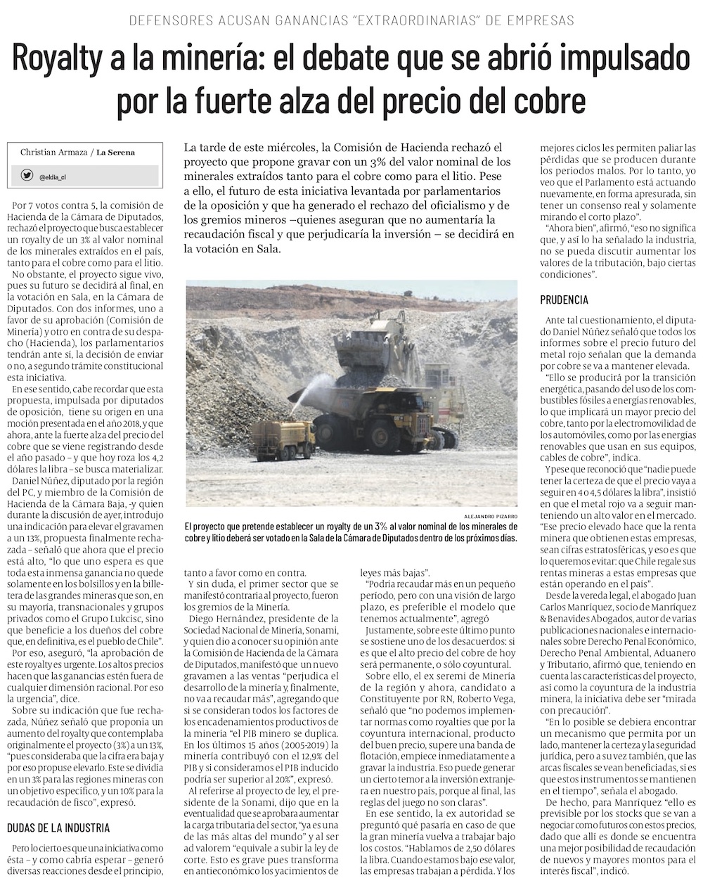 Comisión de Hacienda rechaza proyecto que buscaba instaurar un royalty a la minería - (El Mercurio de Santiago)