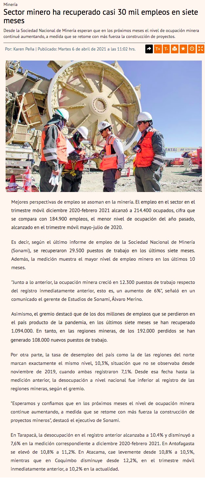 Sector minero recupera cerca de 30.000 empleos en el último trimestre y logra su mayor nivel de ocupación en diez meses - (emol)