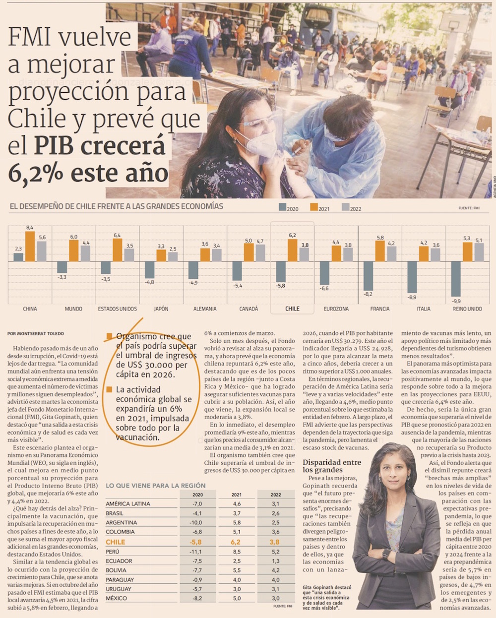 FMI sube su proyección para el PIB de Chile 2021 a 6,2% y el país queda en el top 20 de las mayores alzas del mundo - (Pulso)