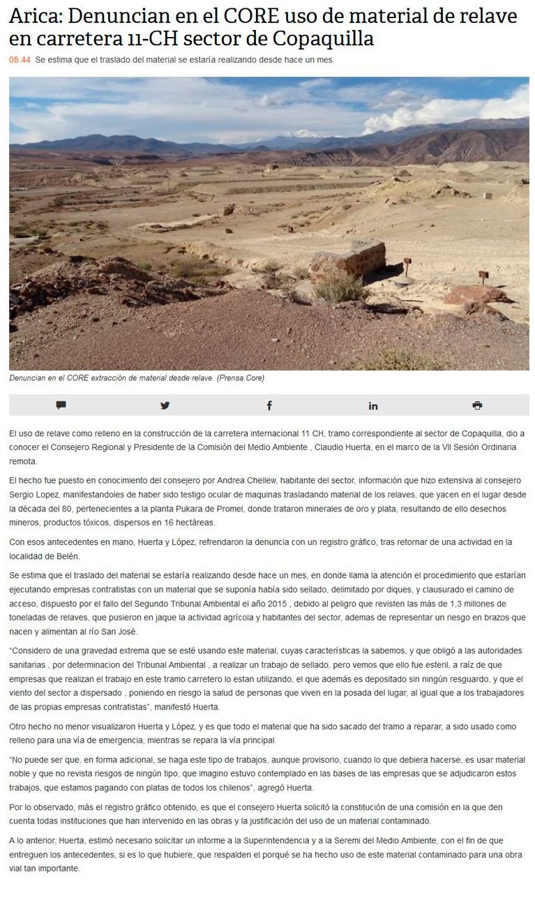 Core denunció uso de relave para trabajos en la ruta 11-Ch - (Estrella de Arica)