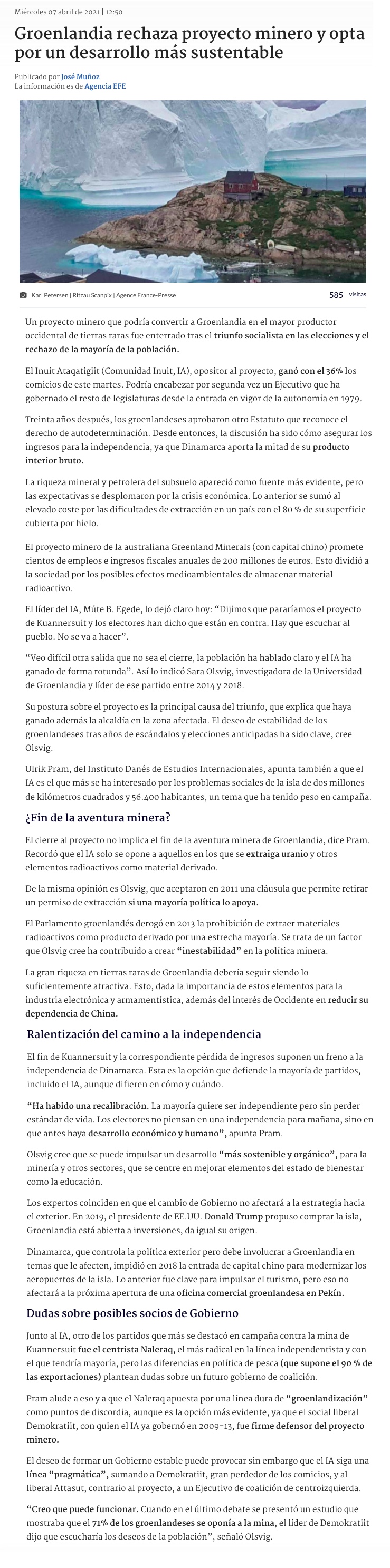 Groenlandia rechaza convertirse en gran productor de tierras raras - (Medios Regionales Cadena El Mercurio)