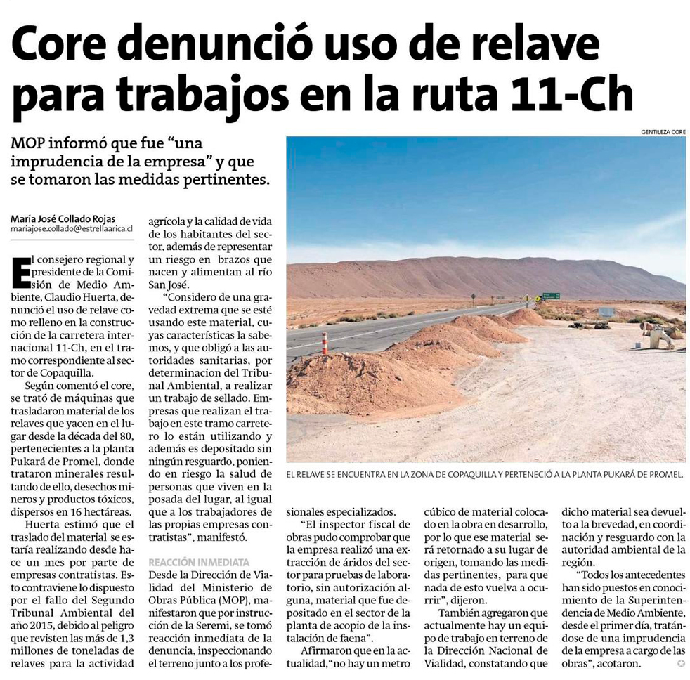 Arica: Denuncian en el CORE uso de material de relave en carretera 11-CH sector de Copaquilla - (soyarica)