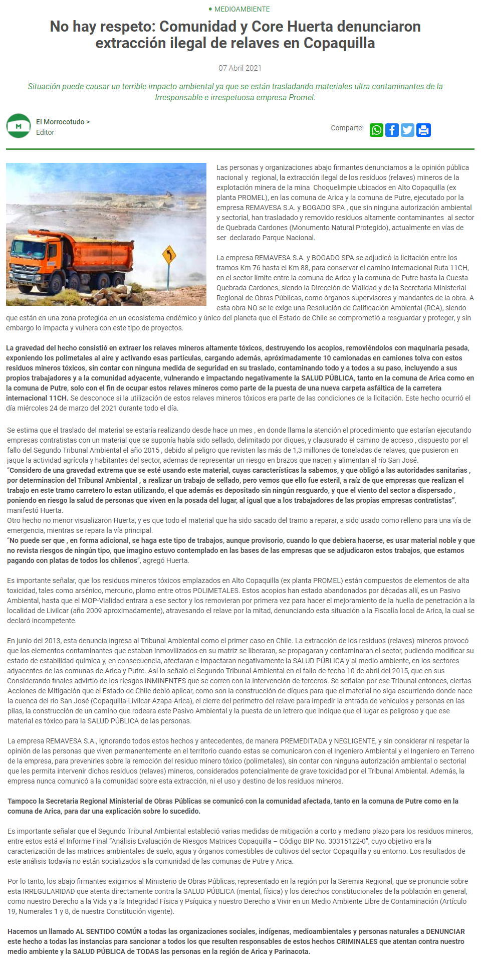 Core denunció uso de relave para trabajos en la ruta 11-Ch - (Estrella de Arica)