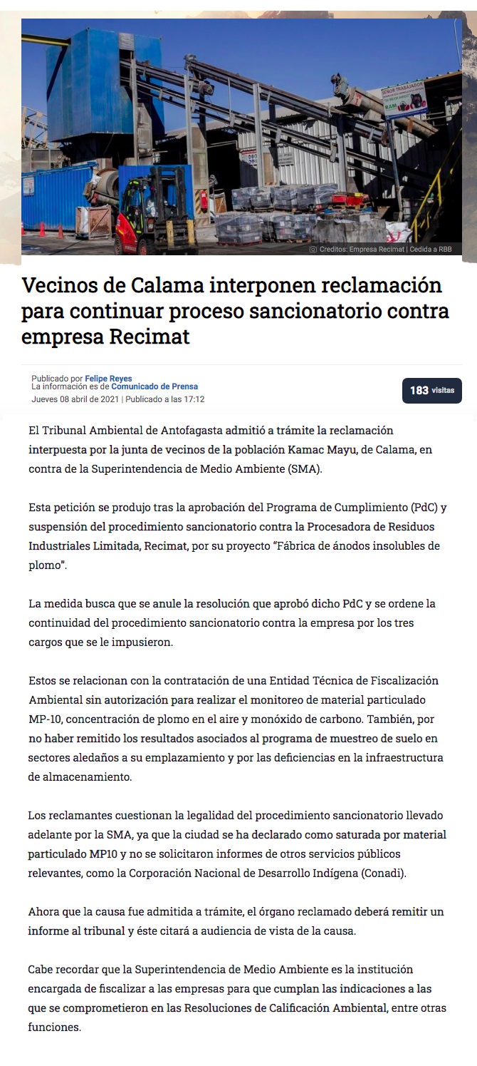Tribunal Ambiental acoge reclamación de vecinos contra la SMA por planta de plomo - (El Mercurio de Calama)