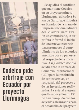 Codelco acusa incumplimiento de Ecuador y solicita arbitraje - (El Mercurio de Santiago)