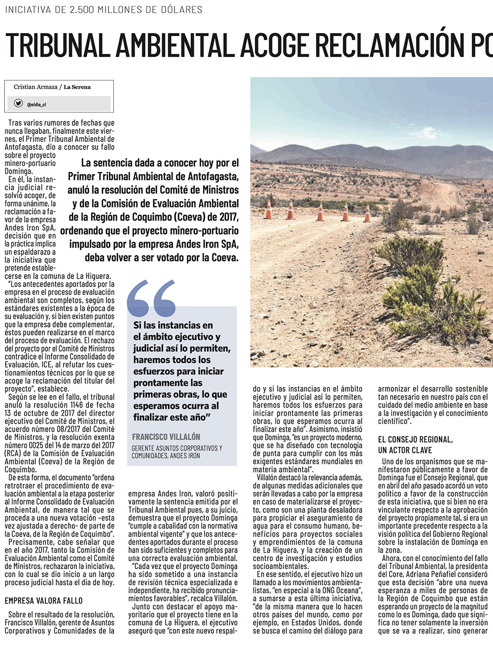 Tribunal Ambiental respalda proyecto minero Dominga y ordena repetir votación - (El Mercurio de Santiago)