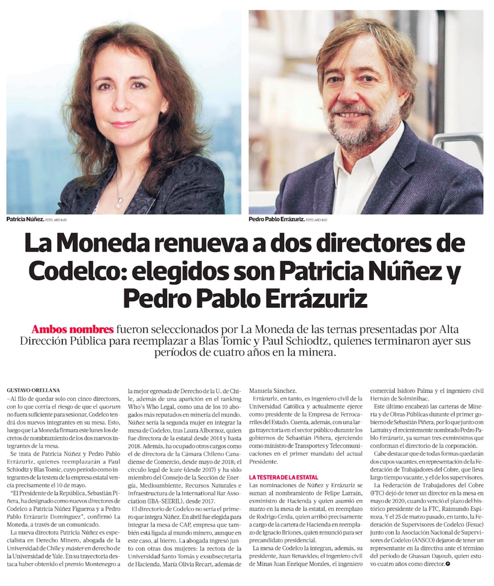Nominan por segunda vez a una mujer para el directorio de Codelco - (El Mercurio de Santiago)