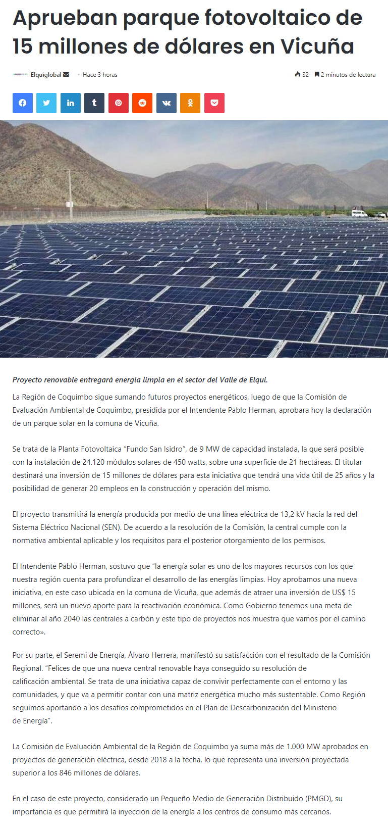 Aprueban parque fotovoltaico de 15 millones de dólares en Vicuña - (El Día)