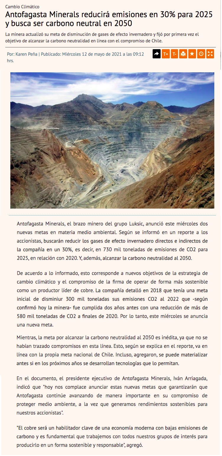 Antofagasta Minerals reducirá en 30% sus emisiones de gases de efecto invernadero a 2025 - (mch.cl)