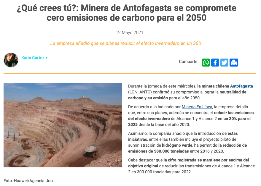 Antofagasta Minerals reducirá emisiones en 30% para 2025 y busca ser carbono neutral en 2050 - (DF Online)