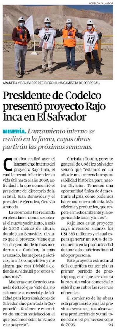 Codelco impulsa obras del proyecto estructural Rajo Inca - (El Mercurio de Santiago)