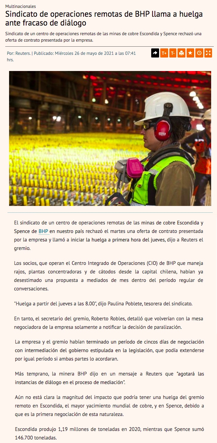 Gremio de centro remoto de Escondida y Spence llama a huelga ante fracaso en diálogo con la empresa - (Pulso Online)