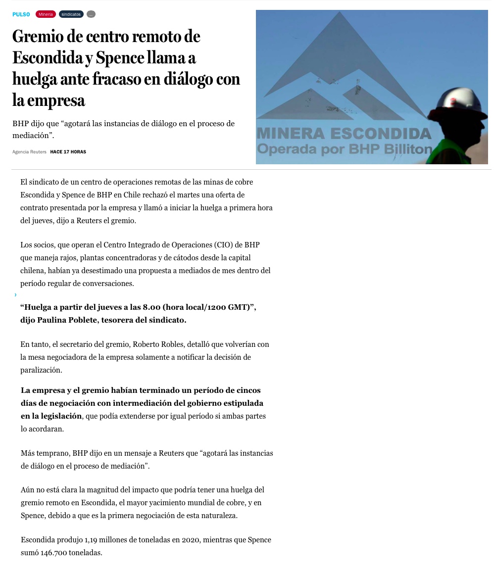Sindicato de BHP rechaza oferta y hoy comienza la huelga - (El Mercurio de Santiago)