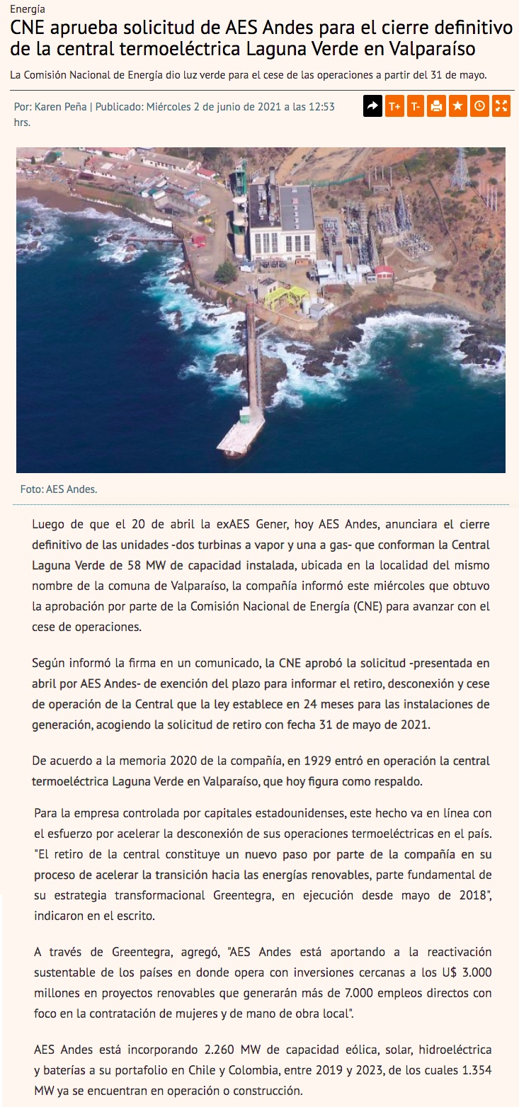 Aprueban el cierre de la central termoeléctrica Laguna Verde tras solicitud de AES Andes - (El Mercurio de Valparaíso)