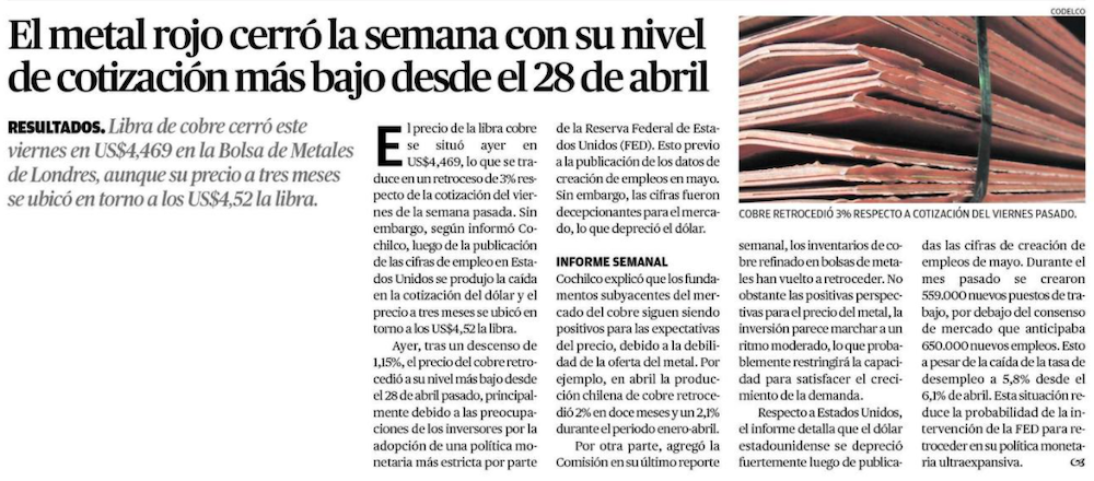 Cobre cae por tercera jornada consecutiva y marca un descenso semanal de 3% - (emol)