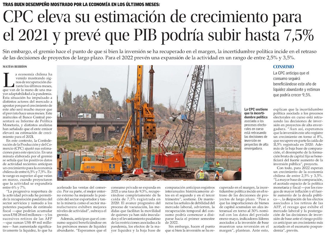 Clapes UC eleva estimación de crecimiento para el 2021 a un rango de 6,5% a 7,5% - (El Mercurio de Santiago)