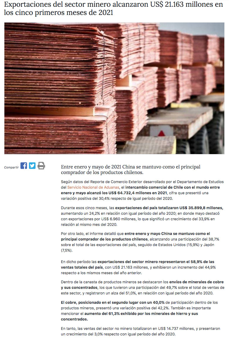 El valor de las exportaciones de cobre alcanza en mayo su nivel más alto en más de una década - (Pulso)