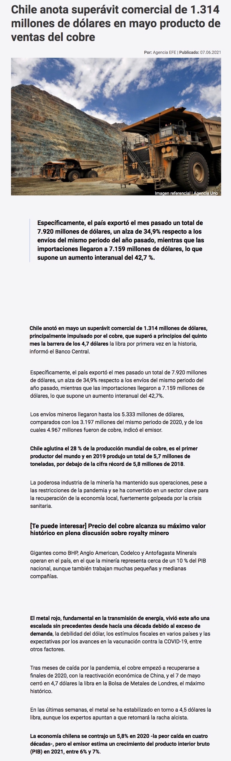 De la mano del cobre: Chile anota superávit comercial de 1.314 millones de dólares en mayo - (biobiochile online)