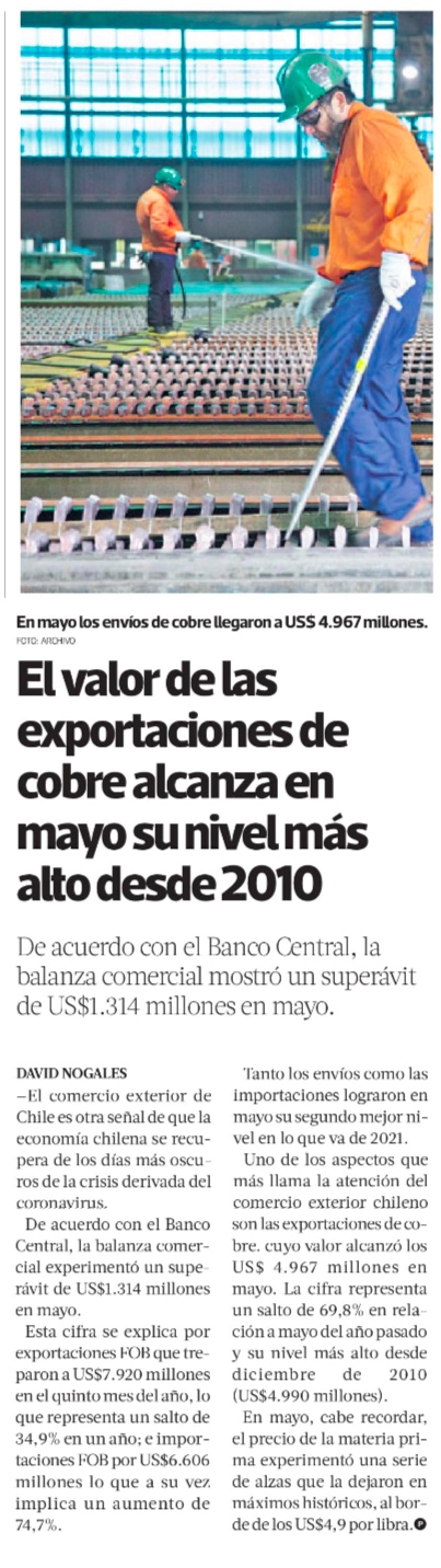 Exportaciones de cobre rozaron los US$5 mil millones en mayo y anotaron su mayor nivel desde diciembre de 2010 - (emol)