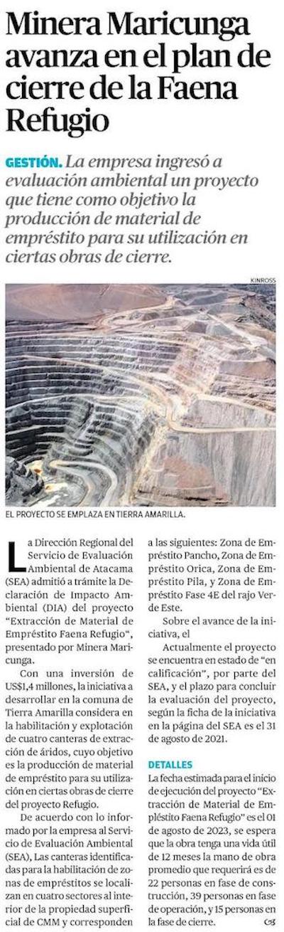 Minera Maricunga avanza en el plan de cierre de la Faena Refugio - (mch.cl)