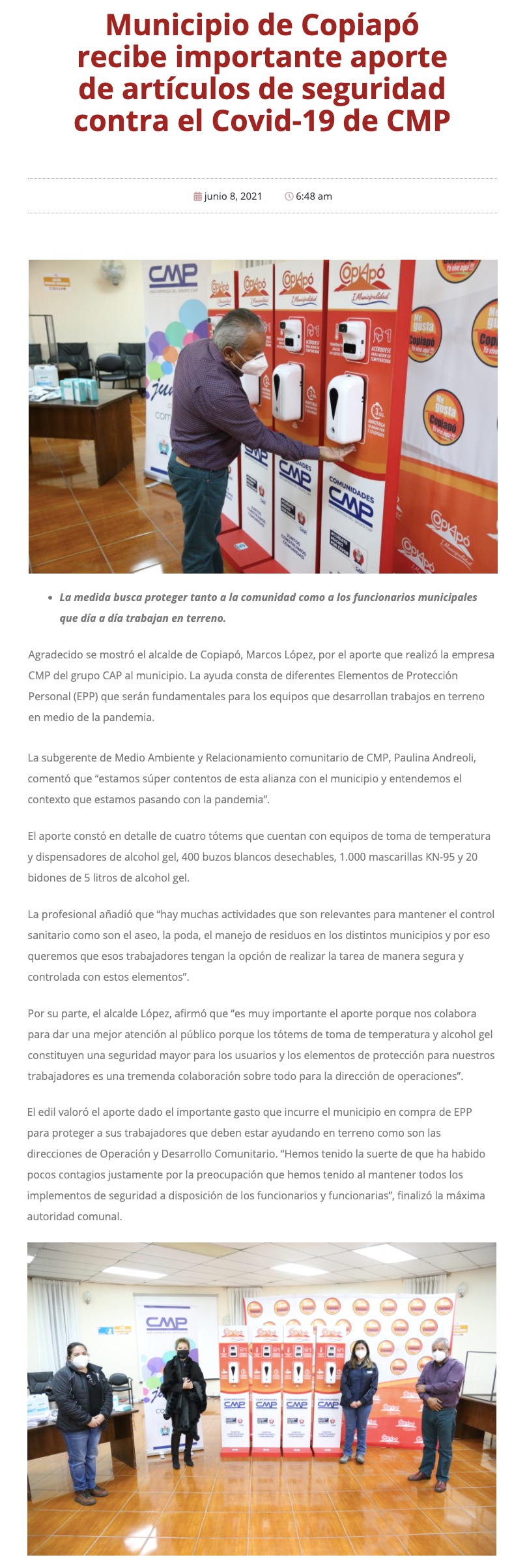 Municipio de Copiapó recibe aporte de artículos de seguridad contra el Covid-19 de CMP - (El Diario de Atacama)