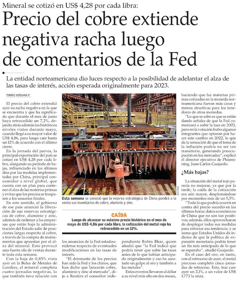 Junio “negro” para el cobre: retrocede 8% en el mes, a su nivel más bajo desde abril - (Diario Financiero)
