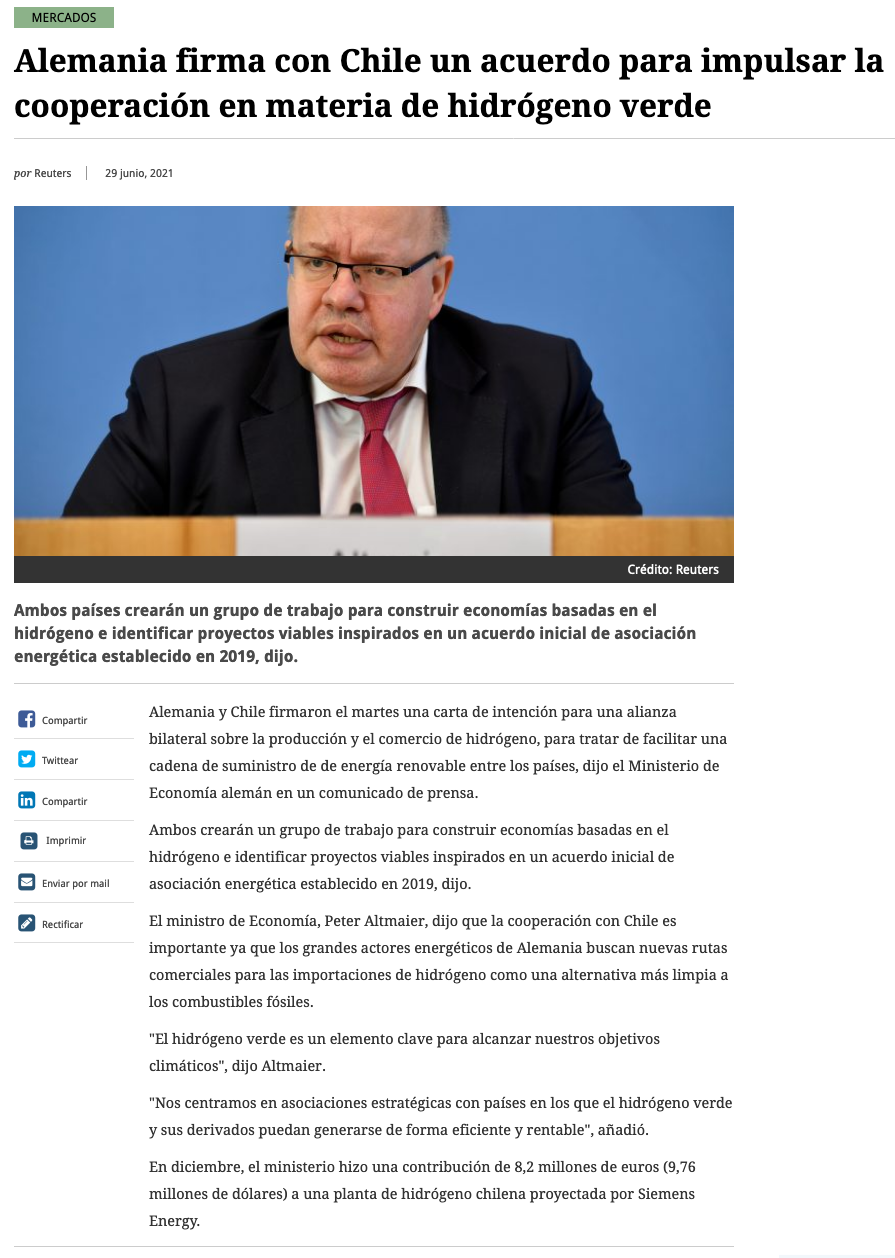 Alemania y Chile firman acuerdo de cooperación para impulsar la producción y el comercio de hidrógeno verde - (emol)