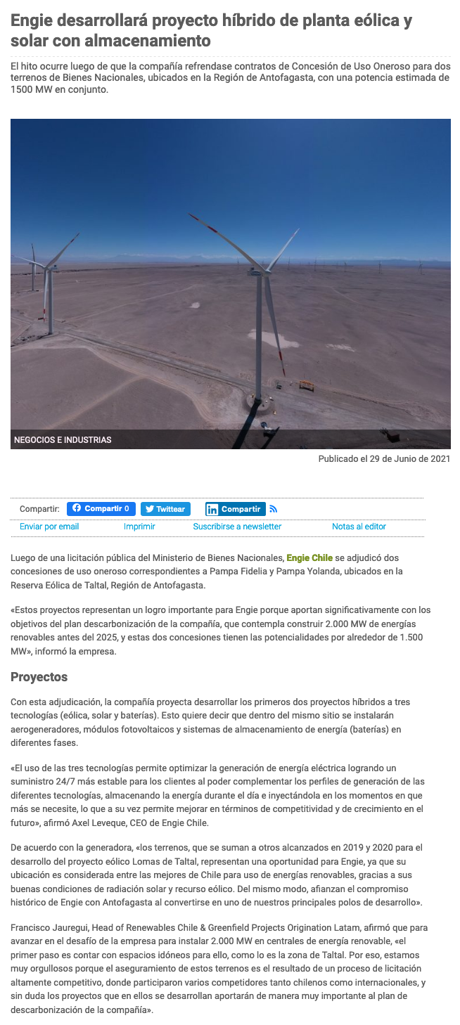 Engie desarrollará dos primeros proyectos híbridos en base a tres tecnologías en Taltal - (El Mercurio de Calama)