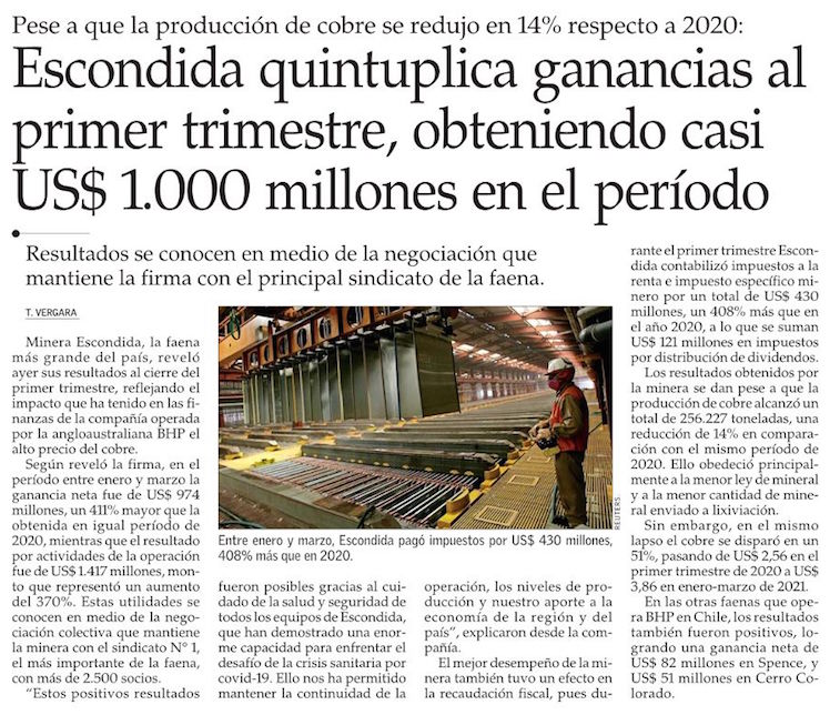Producción de Escondida baja en el primer trimestre, pero ingresos asociados a ventas suben por mayor precio del cobre - (DF Online)