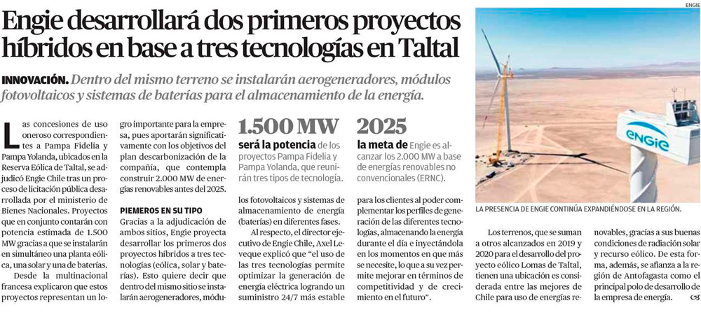 Engie construirá dos proyectos híbridos por hasta 1.500 MW - (El Mercurio de Santiago)