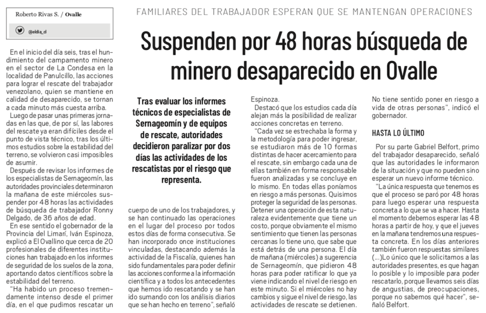 Paralizan operaciones de rescate de minero desaparecido en Panulcillo - (La Región)