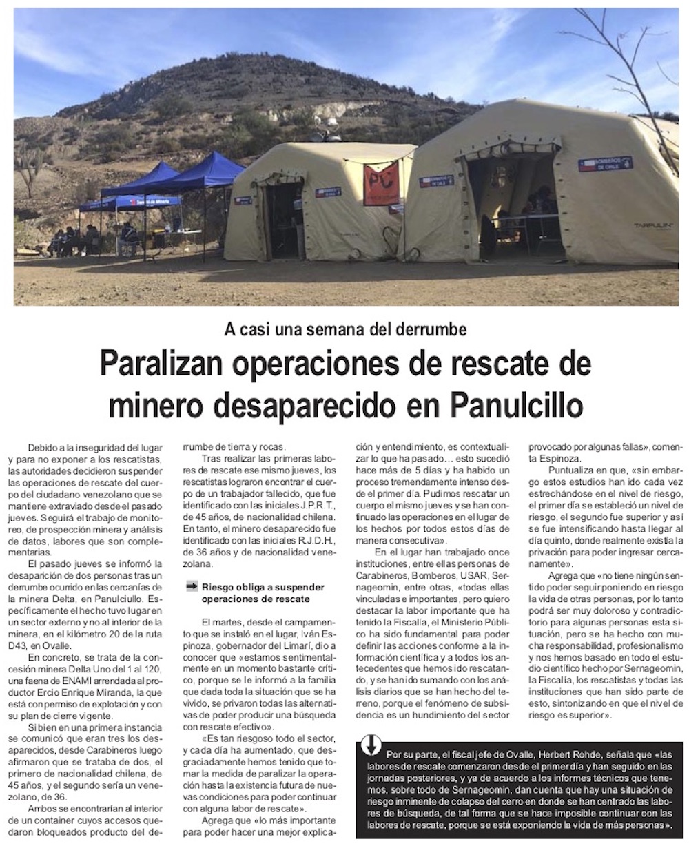 Suspenden por 48 horas búsqueda de minero desaparecido en Ovalle - (El Día)