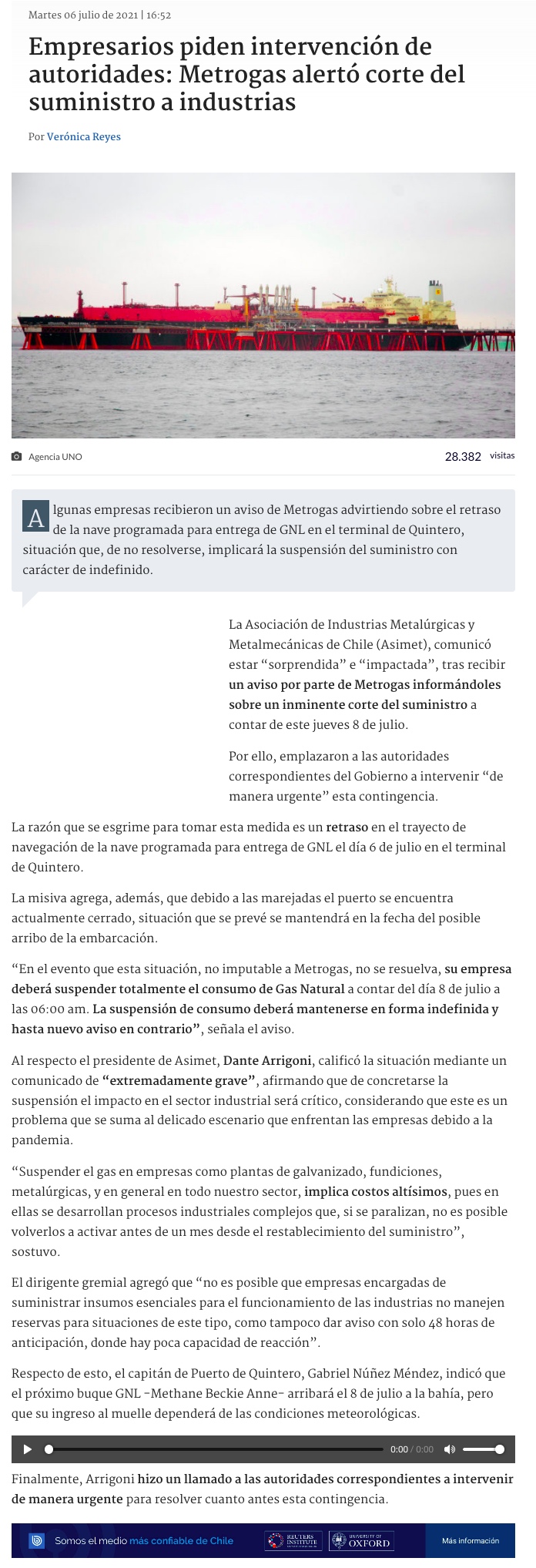 Metrogas enfrenta restricciones para abastecer a sus clientes industriales - (El Mercurio de Santiago)
