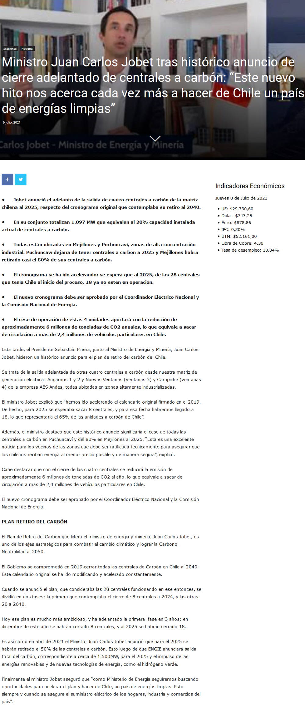 Jobet y cierre centrales a carbón: "Estimaciones que tenemos es que no es posible al 2025 el 100%" - (emol)