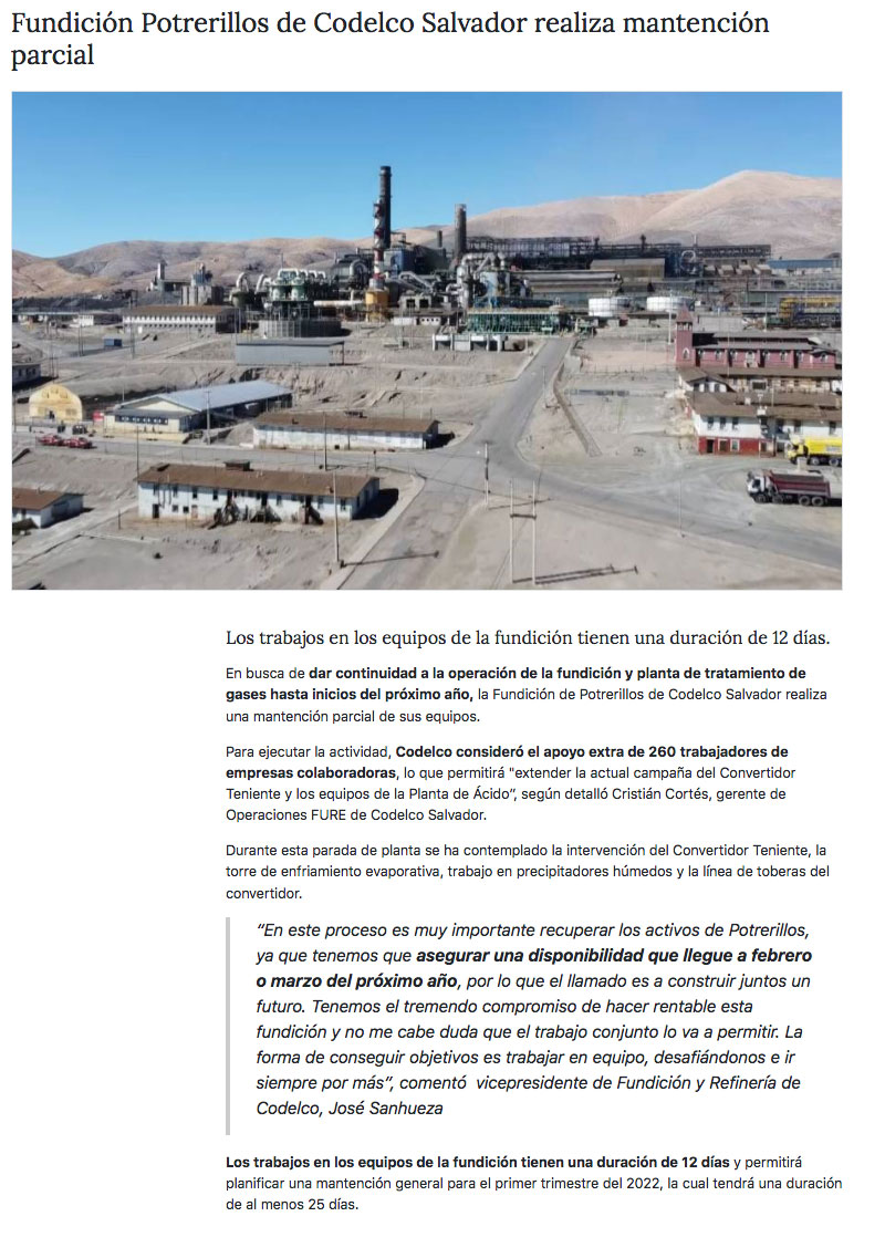 Fundición Potrerillos de Codelco Salvador realiza mantención para desafíos del segundo semestre - (Maray Online)