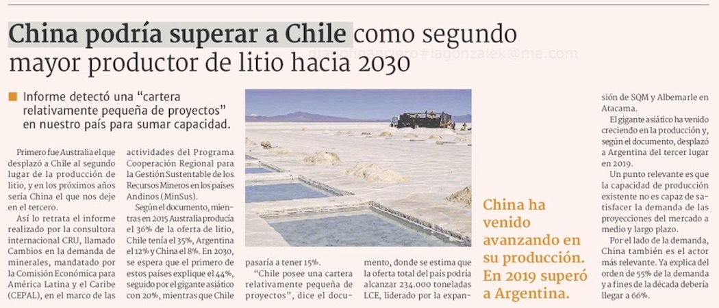 Estudio prevé que China le arrebatará el segundo lugar a Chile como productor de litio a 2030 - (Pulso)