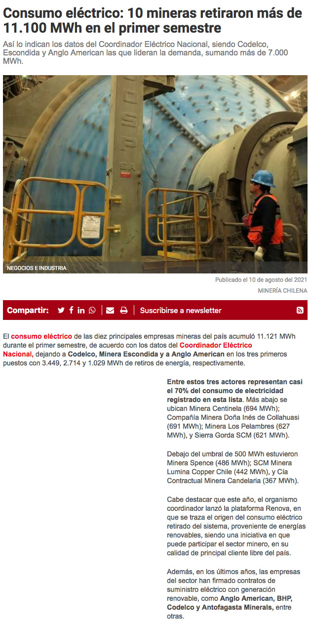 Consumo eléctrico: 10 mineras retiraron más de 11.100 MWh en el primer semestre - (revistaei.cl)