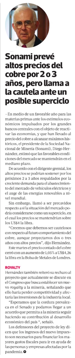 Sonami: Industria minera en Chile espera más años de buenos precios del cobre, pero muestra cautela por considerar un superciclo - (DF Online)