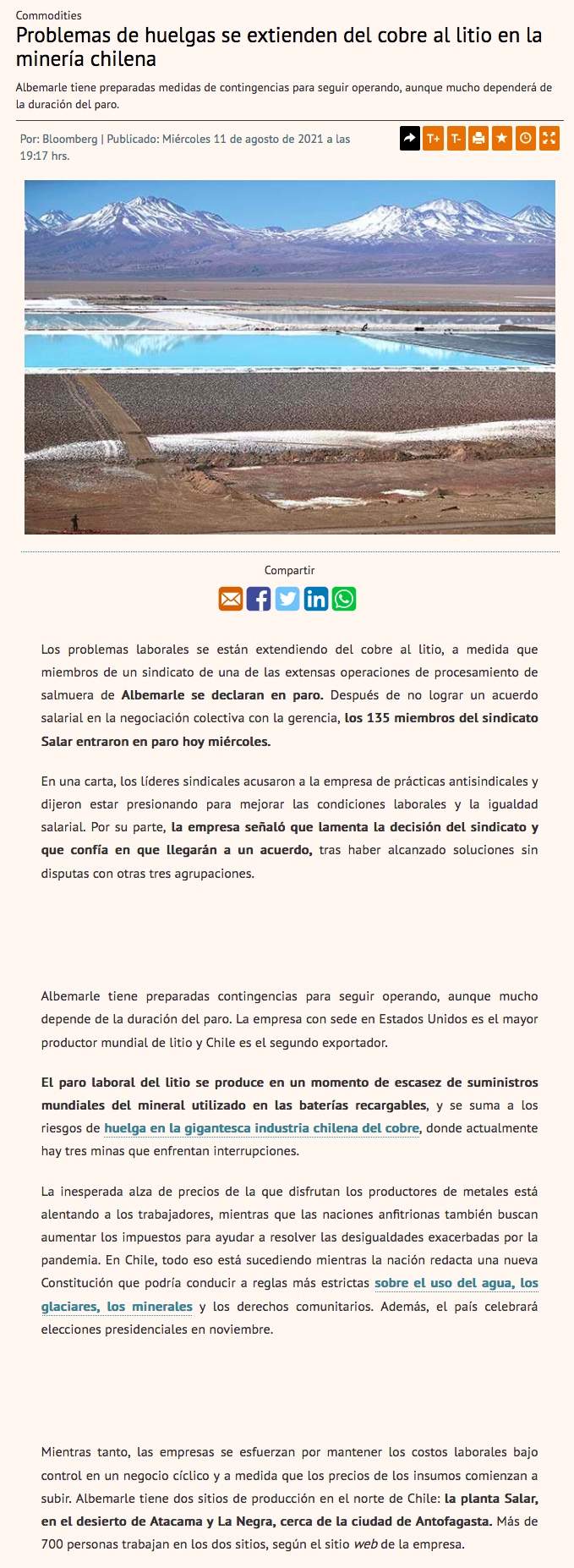 Sindicato de Albemarle no alcanza un acuerdo con la minera e inicia la huelga - (El Mercurio de Antofagasta)