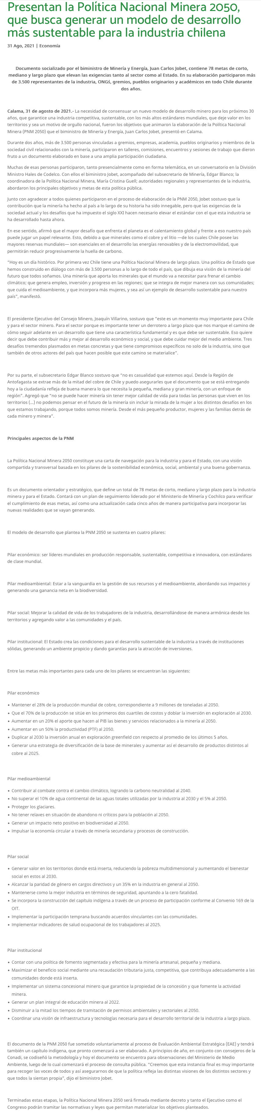 Presentan política nacional de minería con 78 metas a 2050 - (Medios Regionales Cadena El Mercurio)