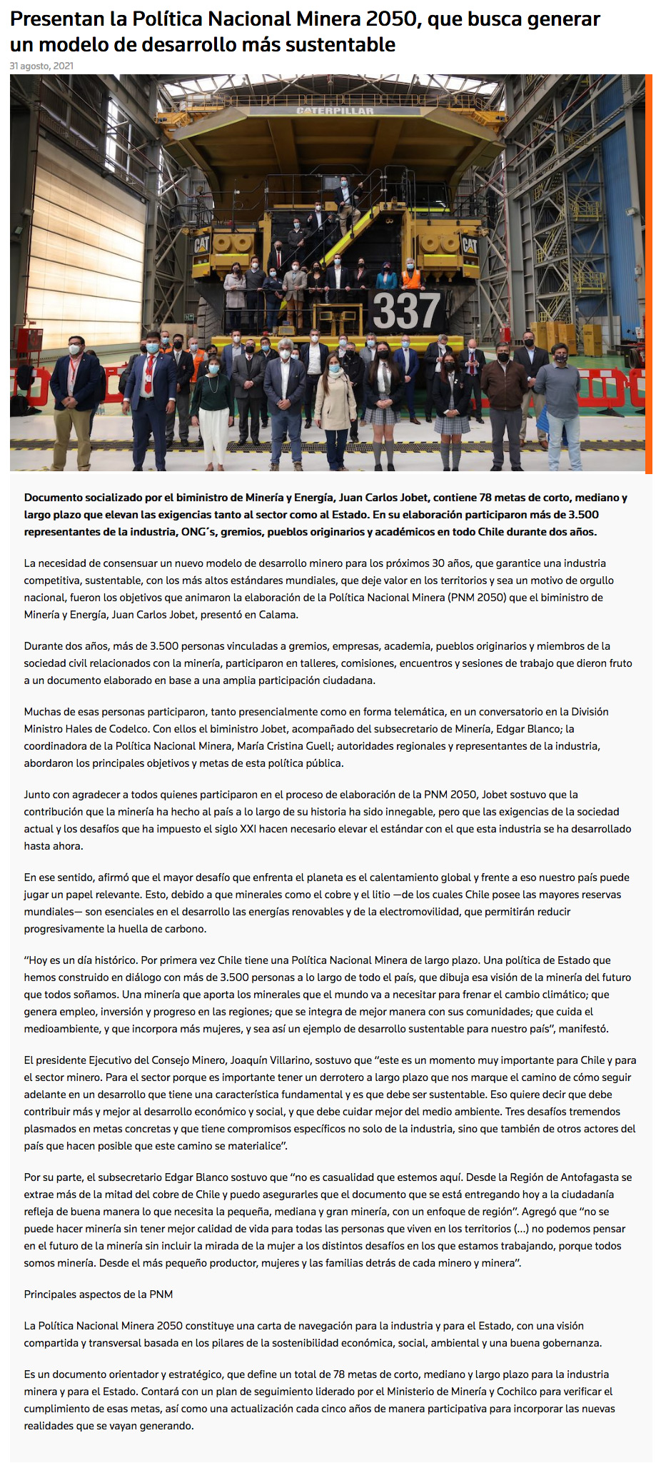 Presentan política nacional de minería con 78 metas a 2050 - (Medios Regionales Cadena El Mercurio)
