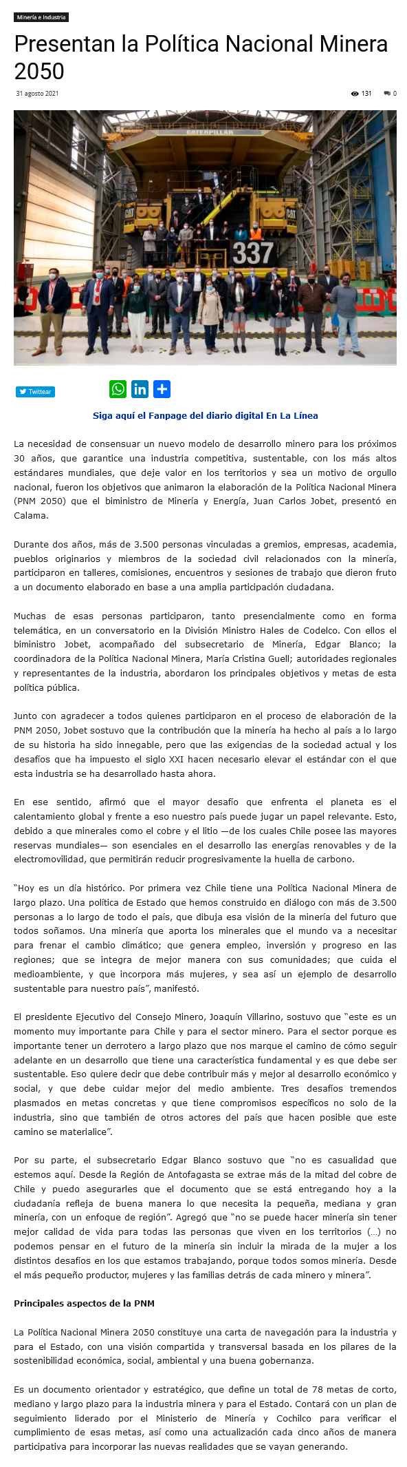 Presentan política nacional de minería con 78 metas a 2050 - (Medios Regionales Cadena El Mercurio)