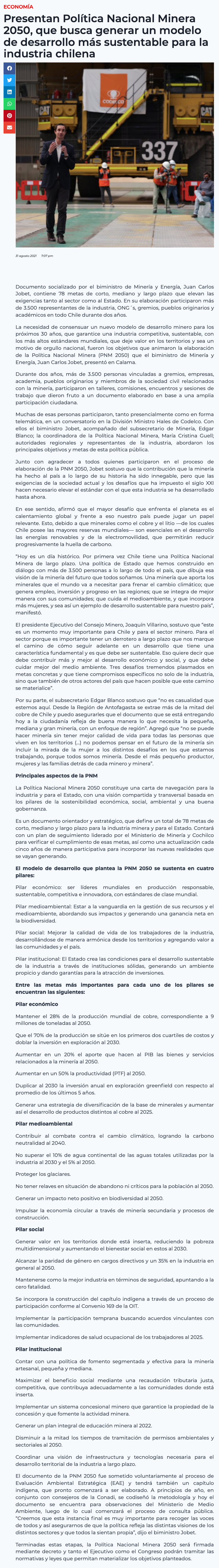 Presentan política nacional de minería con 78 metas a 2050 - (Medios Regionales Cadena El Mercurio)