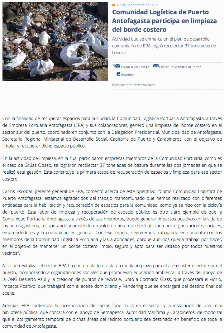 Comunidad Logística de Puerto Antofagasta participa en limpieza del borde costero para la recuperación de espacios públicos de la ciudad - (antofagastanoticias)