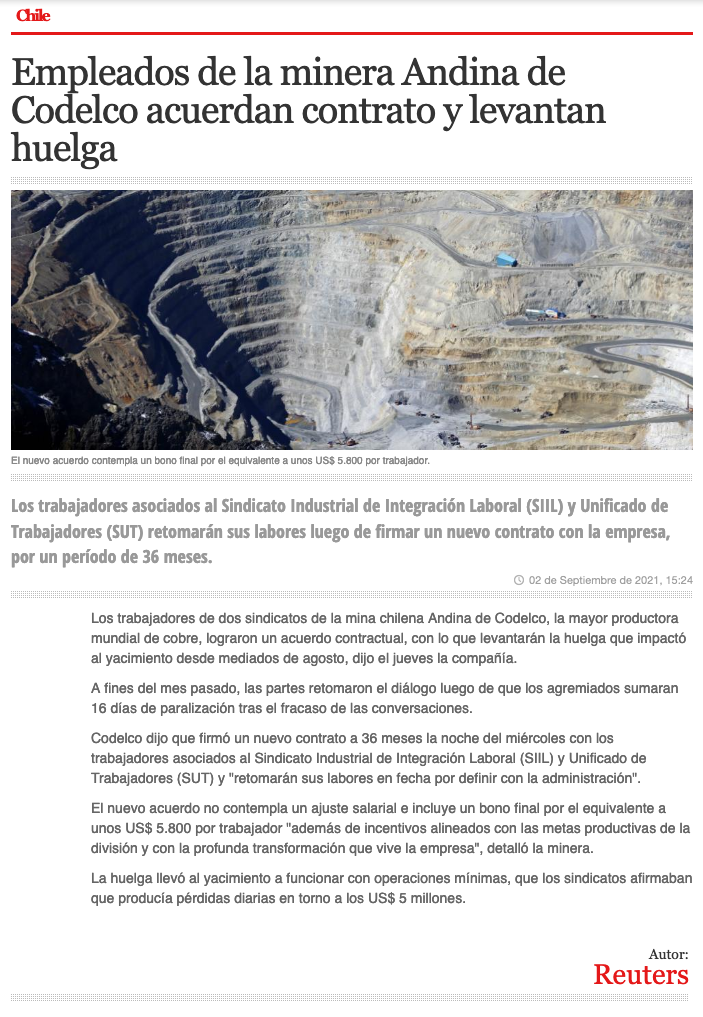 Trabajadores de mina de cobre de Andina terminan huelga en Chile - (bloomberglinea.com)