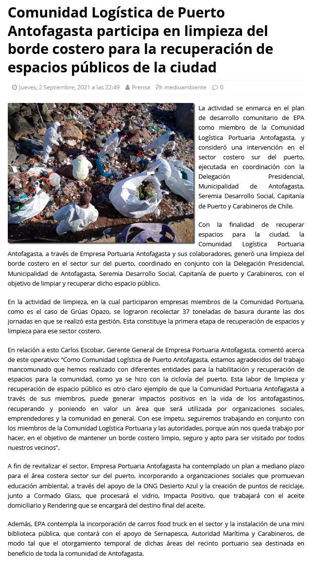 Comunidad Logística de Puerto Antofagasta participa en limpieza del borde costero - (mundomaritimo)
