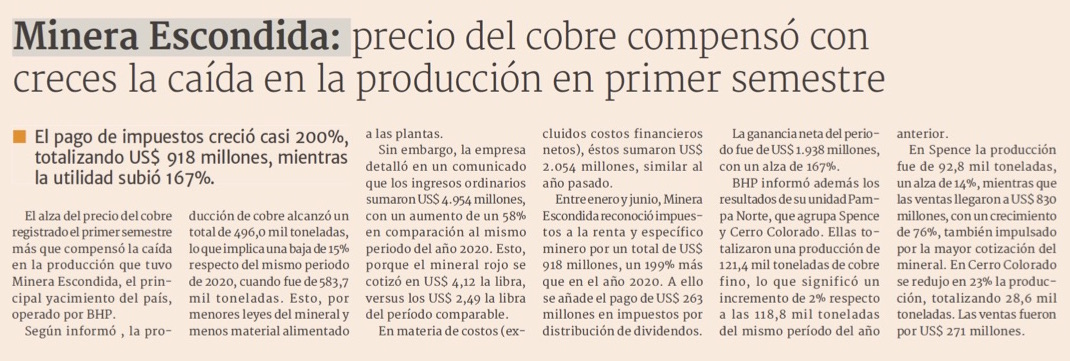 Escondida logra ganancias por US$ 1.938 millones al cierre de junio - (El Mercurio de Santiago)