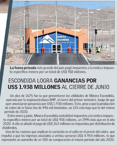 Minera Escondida: precio del cobre compensó con creces la caída en la producción en primer semestre - (Diario Financiero)