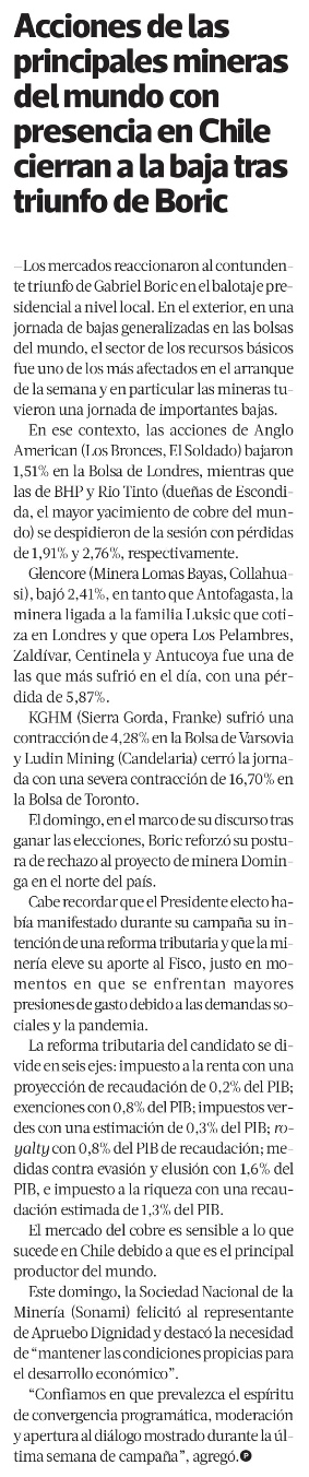 Grandes Mineras acusan impacto del resultado de la elección presidencial en su cotización bursátil - (El Mercurio de Santiago)