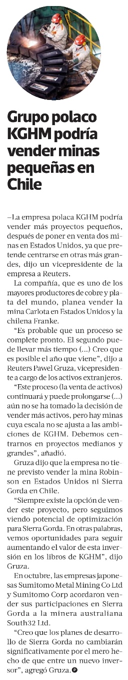 Minera polaca KGHM reafirma sus planes de vender yacimiento Franke en Chile - (DF Online)